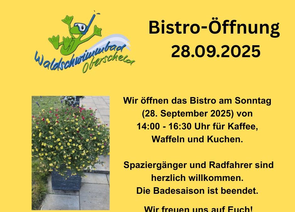 Wir öffnen das Bistro im Waldschwimmbad Oberscheld am Sonntag (28. September 2025) für Wanderer, Spaziergänger und Radfahrer.