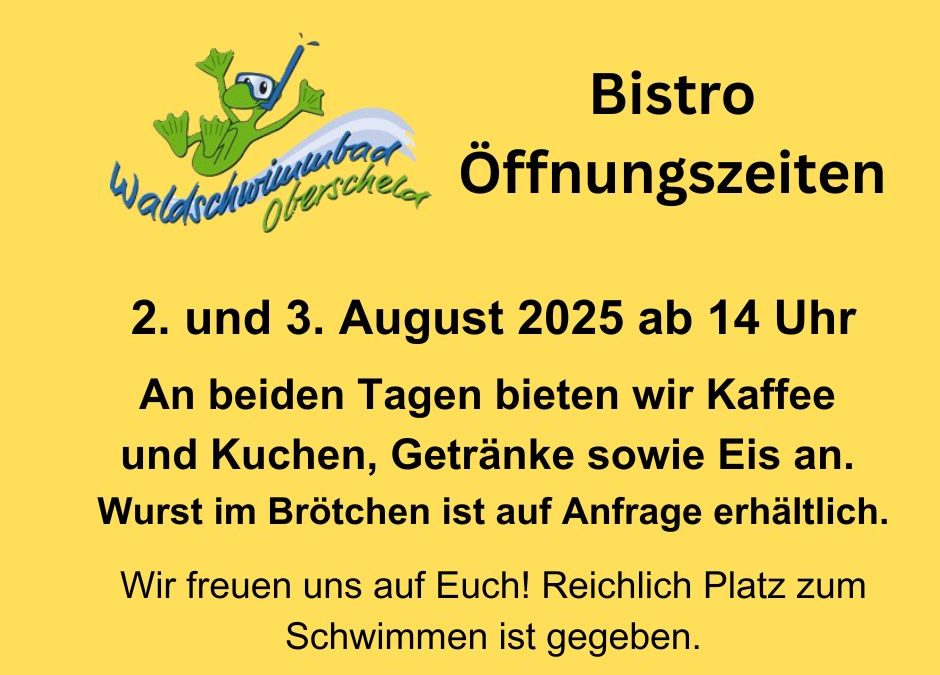 Witterungsbedingt begrenzen wir die Bistro-Öffnungszeit an diesem Wochenende. Wir öffnen am 2. und 3. August erst ab 14 Uhr das Bistro.