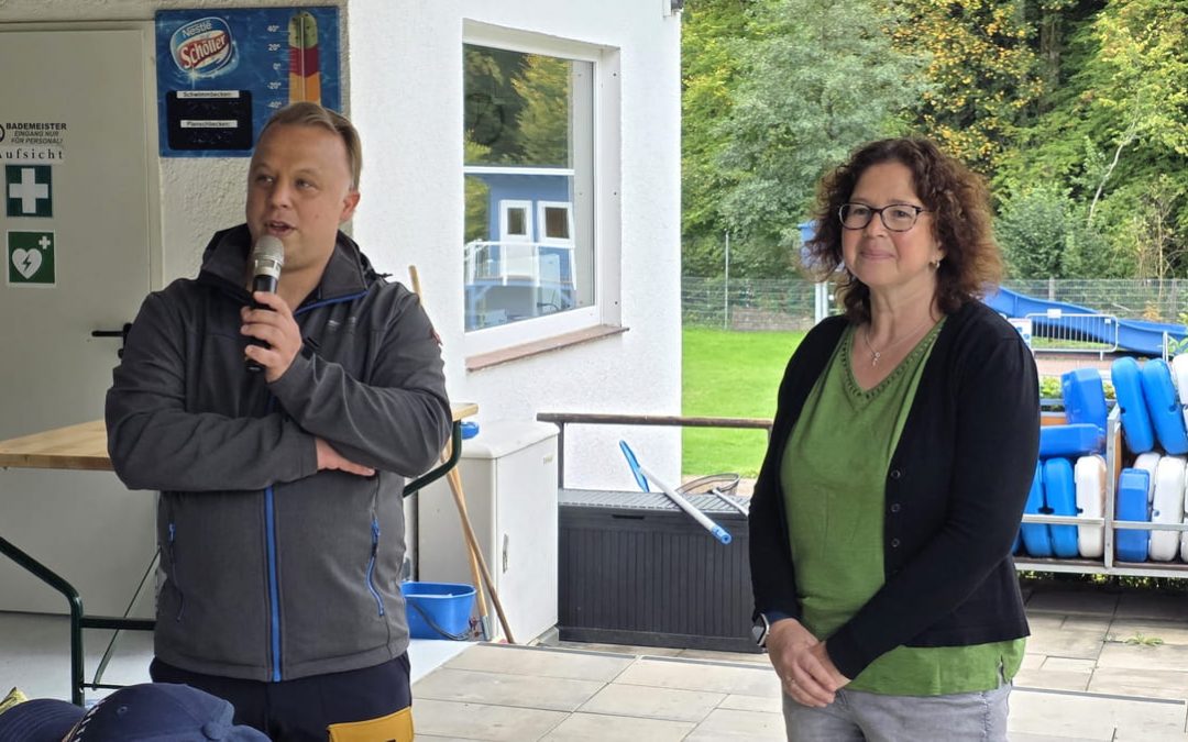 Gelebtes Ehrenamt findet nunmehr seit über 20 Jahren im Waldschwimmbad Oberscheld statt. Und es ist eine wichtige Aufgabe, den vielen ehrenamtlichen Helfern einer Saison „Danke“ zu sagen. Dies hatten am 21. September die Vorsitzende des Fördervereins Waldschwimmbad Oberscheld e.V., Sandra von Dessonneck, und Christian Gwisdalla, Büroleiter der Stadt Dillenburg und seit August 2024 Vertreter der Stadt im Förderverein, übernommen. Er verwies auf die nicht ganz leichte Saison und Wetterprobleme (mal Hitze, mal Nässe) und eine im Vergleich zum Vorjahr trotzdem höhere Besucherzahl im Bad.