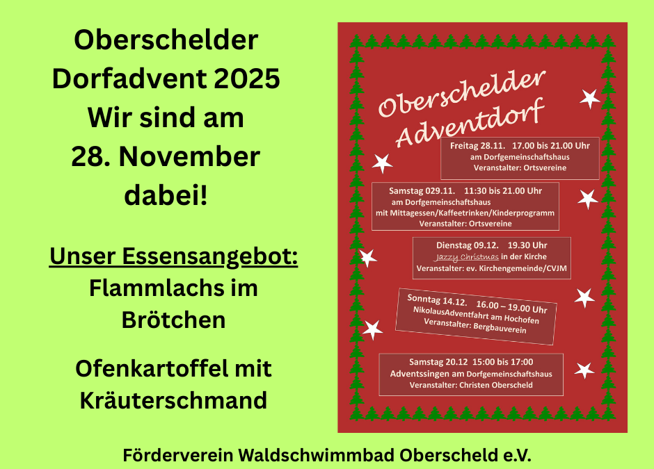 Der Förderverein Waldschwimmbad Oberscheld beteiligt sich am 28. November 2025 mit einem Essensangebot. Zur Wahl stehen „Flammlachs im Brötchen“ und „Ofenkartoffel mit Kräuterschmand (Kräuterquark)“. Die Veranstaltung geht von 17 bis 21 Uhr.