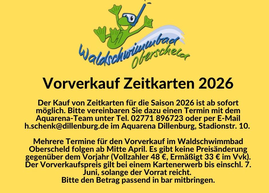 Der Kauf von Zeitkarten für die Saison 2026 ist ab sofort möglich. Bitte vereinbaren Sie dazu einen Termin mit dem Aquarena-Team unter Tel. 02771 896723 oder per E-Mail h.schenk@dillenburg.de im Aquarena Dillenburg, Stadionstr. 10.