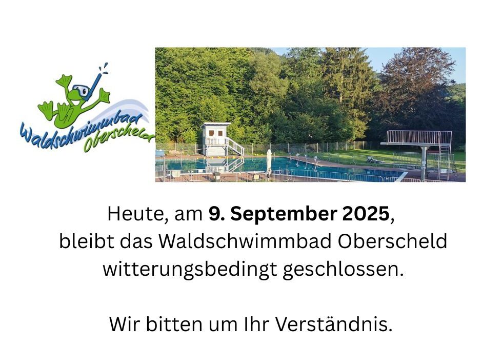 Wegen der aktuellen Wetterlage bleibt das Waldschwimmbad Oberscheld heute, am 9. September 2025, geschlossen.